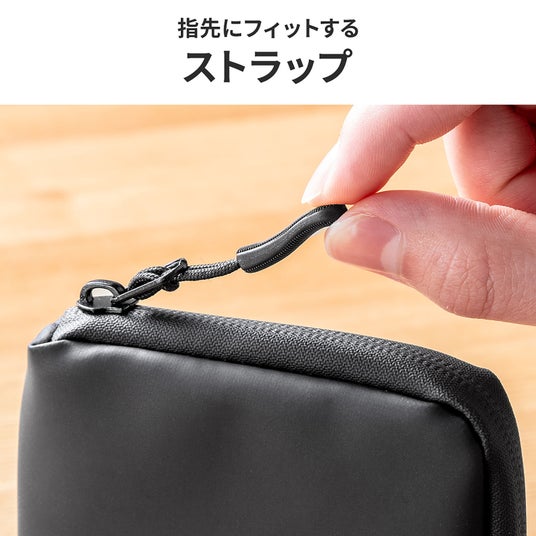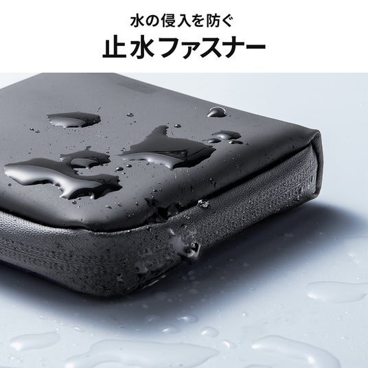 止水ファスナーで水の侵入をブロック。ファスナーストラップは指先にフィットして開閉がスムーズ。
