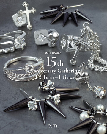 イー・エム・デザイン株式会社e.m.難波店にてクールなブラックカラーのスタッズジュエリーを店舗限定で新発売。またe.m.のアーカイブジュエリーも登場する期間限定イベントを開催いたします。イー・エ...