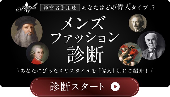 株式会社S-styleかんたん約1分で無料診断!自分の性格や個性をもとに、歴史上の偉人になぞらえたファッションスタイルが判明しますエグゼクティブ向けのファッションスタイリングを提供する株式会社S...