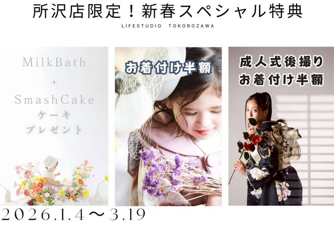 株式会社アップルツリーファクトリー埼玉県所沢市にあるフォトスタジオ「ライフスタジオ所沢店」では、2026年1月4日~3月19日の期間、ベビーからご家族まで楽しめる3つの特典をご用意した“新春スペ...